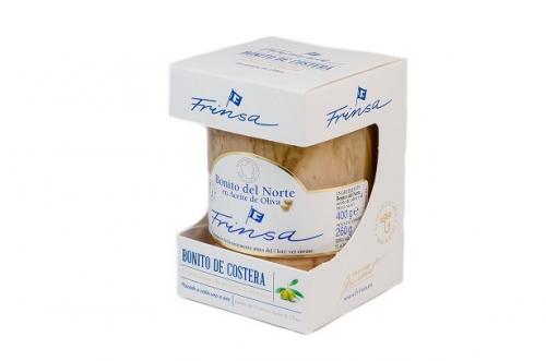 El Bonito de Costera en Aceite de Oliva Frinsa está disponible en tarros de vidrio de 190, 260 y 400 grs. que se presentan en atractivas cajas expositoras individuales.