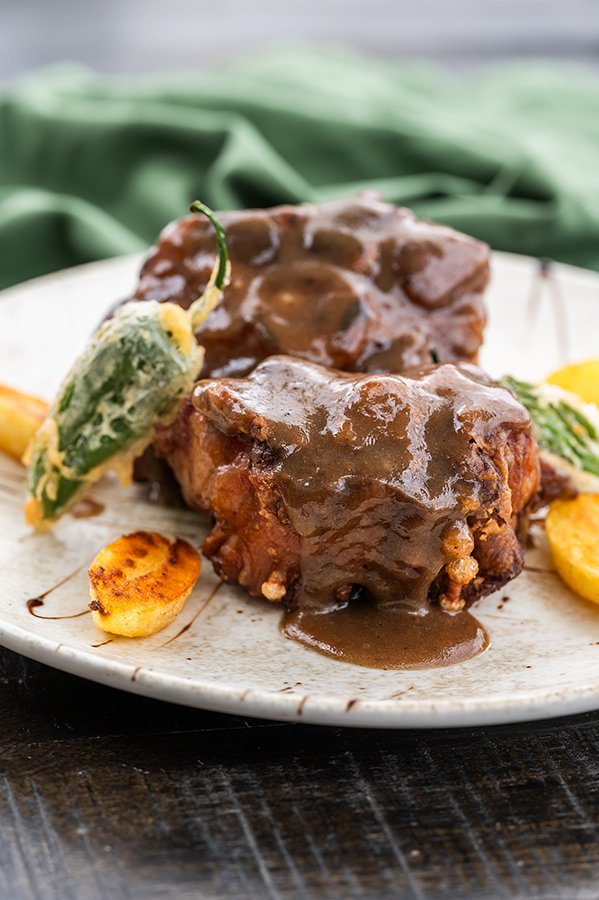 Rabo de toro estofado al vino tinto con patatas diente de ajo
