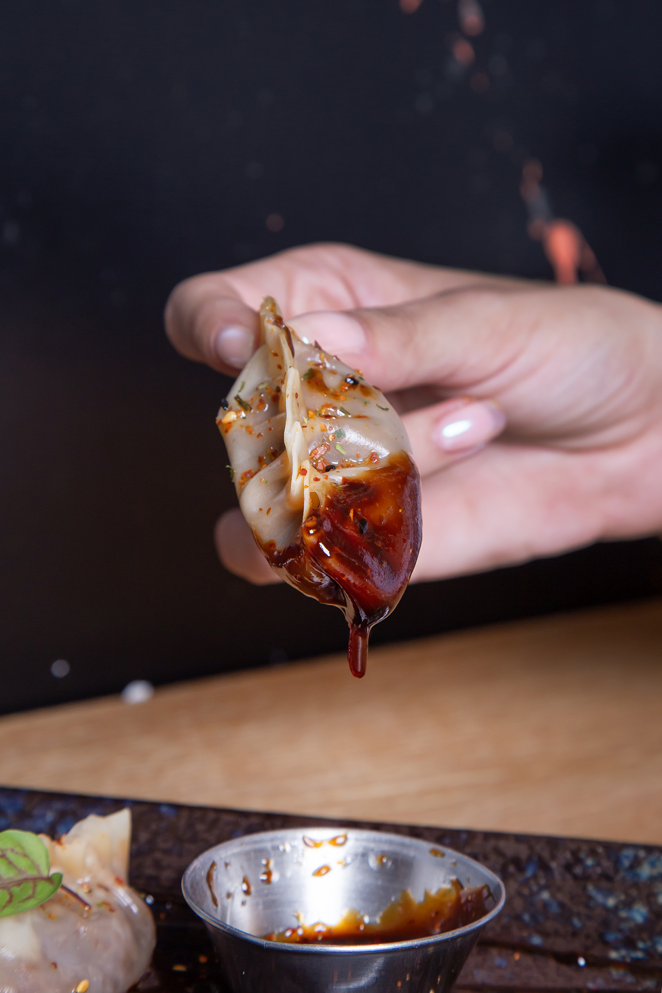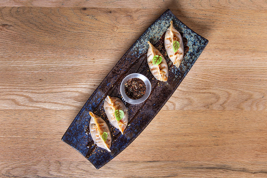 Gyozas de rabo de toro con salsa demiyaki, BBQ y shichimi (12 €)