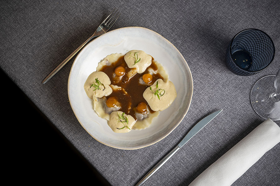 Ravioli de toro, foie y trufa (19 € ración; 10 € media)