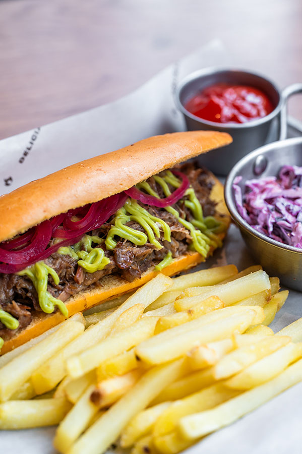 Toroloco, Po’boy de rabo de toro guisado durante 24 h, guacamole y cebolla encurtida (14’85 €)