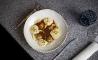 Torrija con helado de vainilla, manzana y espuma de chocolate negro