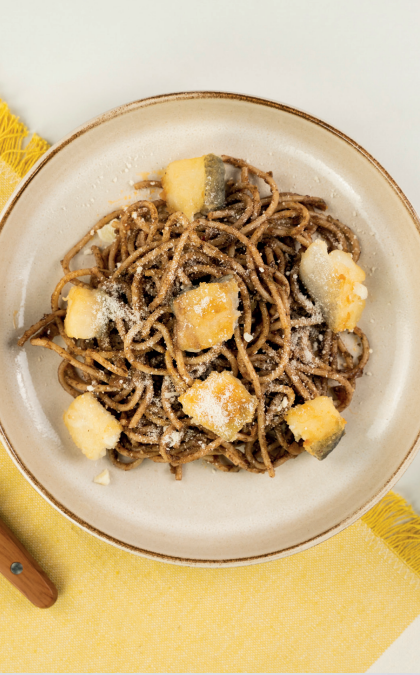 Mezcla hasta que todo se integre y reserva en caliente. Para preparar el bacalao enharina los dados y resérvalos. Calienta un poco de aceite de oliva y saltea las piezas de bacalao durante 3-4 minutos a fuego medio. Para finalizar, sirve los espaguetis con la salsa Puttanesca en un plato. Incorpora los dados de bacalao sobre la pasta y espolvorea un poco de parmesano rallado por encima.