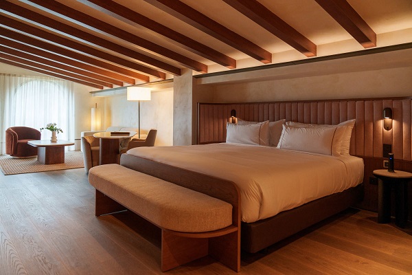 Todo esto dialoga con naturalidad con la alta calidad de los materiales elegidos en la construcción; las maderas nobles, la piedra, así como con los cálidos colores —distintas gamas de burdeos, beiges y tonos tierra— que están presentes en todo el hotel.