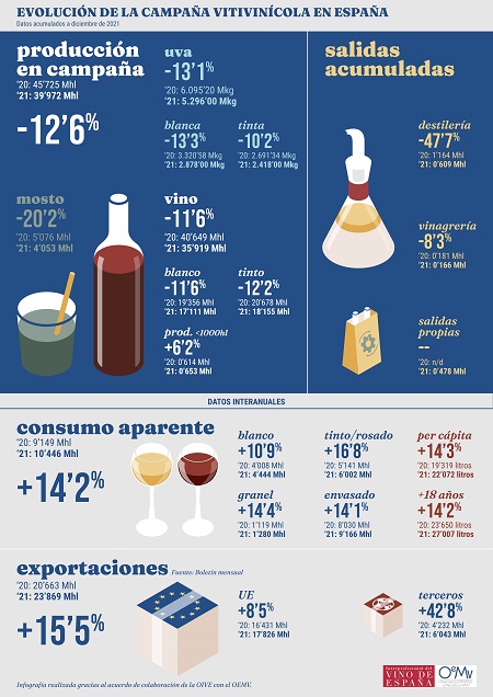 14 de febrero de 2022El consumo de vino en España se recupera en 2021 y mantiene su tendencia alcista por quinto mes consecutivo. Según el último informe económico de la Interprofesional del Vino de España (OIVE), los datos registrados -con fecha de diciembre de 2021- reflejan un consumo de 10,4 millones de...