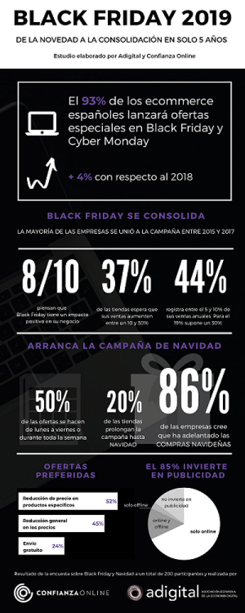 18 de noviembre de 2019Según el estudio sobre las campañas de Black Friday y Navidad 2019 en comercio electrónico, realizado por la Asociación Española de la Economía Online (Adigital) y Confianza Online, el 93% de los comercios electrónicos de nuestro país lanzará descuentos y ofertas especiales durante esta edición de...