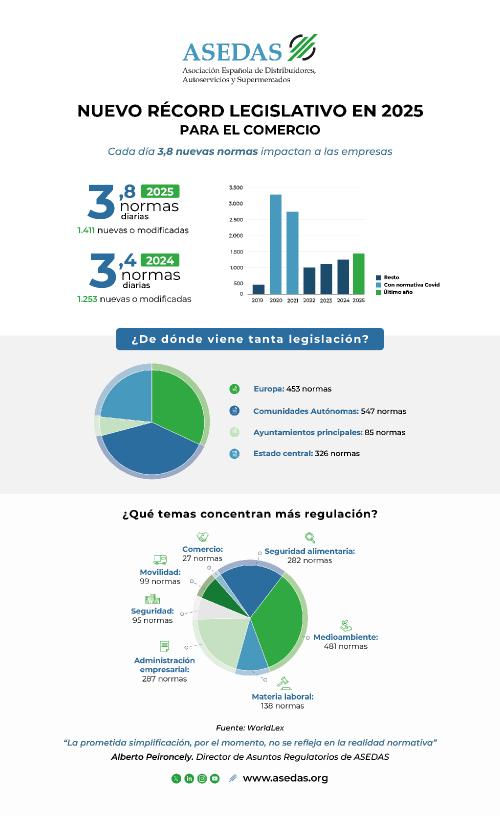 13 de enero de 2026Durante 2025 se aprobaron o modificaron 1.411 textos normativos (leyes, reglamentos u otro tipo de normas jurídicas de distinto signo) *, lo que significa que cualquier comercio tuvo que conocer y ejecutar 3,8 nuevas normas cada día. De este modo, se marca un nuevo récord en la presión normativa,...