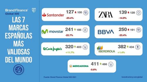 26 de enero de 2021Santander, Zara, Movistar, BBVA, El Corte Inglés, Iberdrola y Mercadona, las 7 marcas españolas más valiosas del mundo resisten a la pandemia, según el último informe anual Global 500 2021 de Brand Finance, la consultora líder independiente de valoración de intangibles cuyos rankings cumplen con...