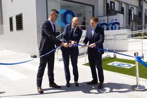François Pinto, director general de STEF España; Jorge Gallardo, alcalde de Cártama, Manuel Marver, director delegación STEF Málaga durante el corte de cinta inaugural de la nueva plataforma logística en Cártama.