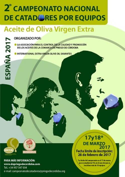EI II Campeonato Nacional de Catadores por equipos organizado por la Asociación para el Control de la Calidad y Promoción de los Aceites de la Comarca de Priego de Córdoba (ASCCAL) y la Organización Extra Virgin Olive Oil International Savantes abre el plazo de inscripción.
