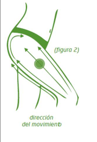 Empezar haciendo movimientos circulares, subiendo la CeluliCup de la rodilla hasta la cadera. Después, moverla a lo largo de la pierna, por esa misma zona en línea recta hacia el corazón. Finalizar el masaje efectuando “s” de arriba abajo (figura 2).