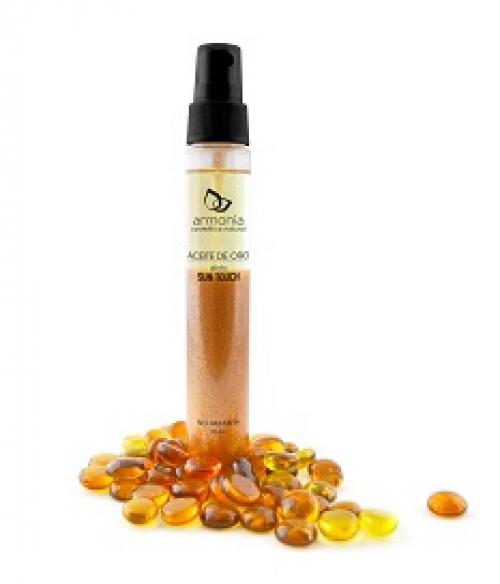 Armonia Cosmética Natural presenta el aceite de oro, un aceite seco que trata y embellece la piel, al incluir diminutas partículas doradas que resaltan el tono bronceado de la piel junto con un perfume natural de notas frutales frescas que evocan una noche de verano.