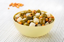 Ingredientes: Aceitunas verdes, kikos, dados de queso manchego, dados de pepinillo, aceite de oliva virgen extra.
