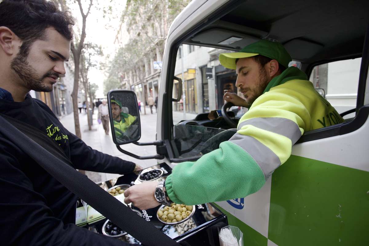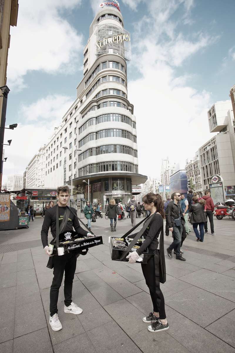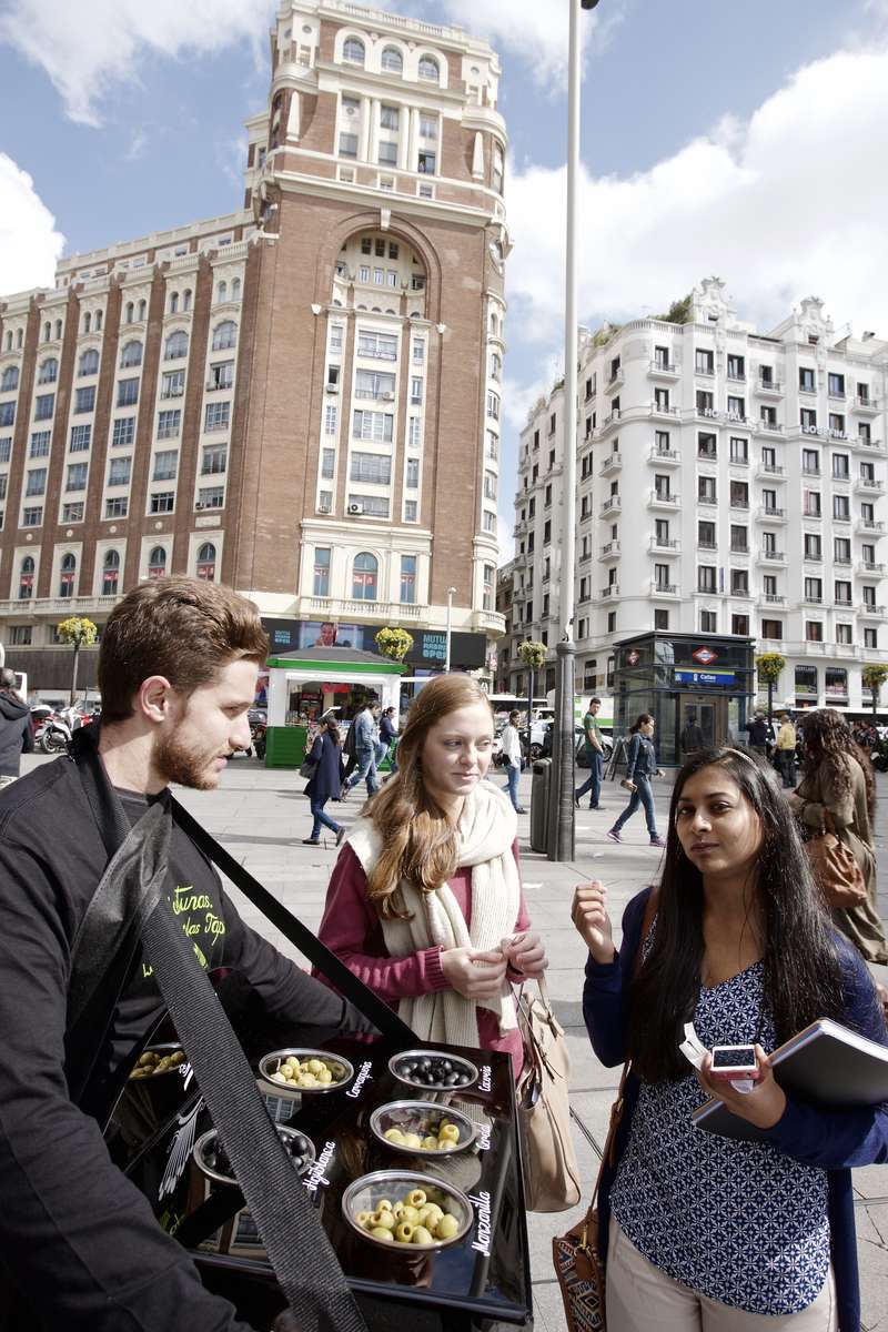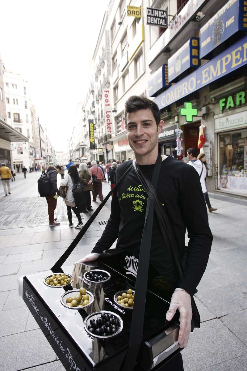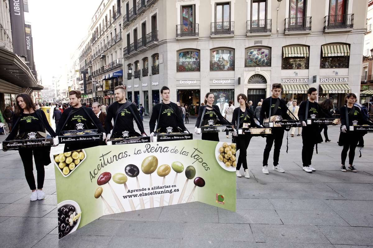 Buscando un contacto directo con el público, un grupo de 15 Aceituneros recorre los puntos neurálgicos de las ciudades de Madrid, Sevilla, Valencia,