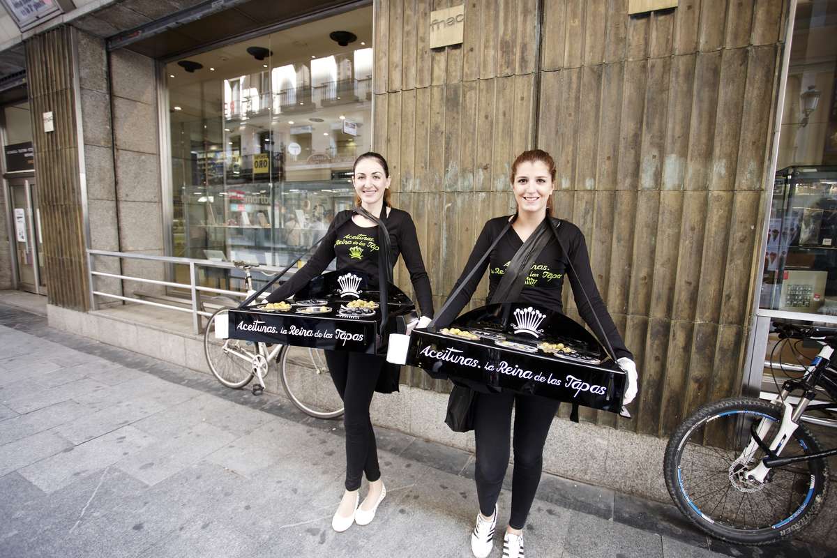 Málaga, Mérida, Murcia, Córdoba y Cáceres, entre los meses de abril y junio de 2015. Siempre, en un momento estratégico, de 11 a 15 horas, y los días de mayor afluencia de público, viernes y sábado. Además, se reparten cerca de 100.000 folletos informativos donde el público dispone de toda la información sobre la Reina de las Tapas. Como novedad, serán presentadas al público con el nombre de sus respectivas variedades: hojiblanca, manzanilla, carrasqueña, cacereña y gordal.