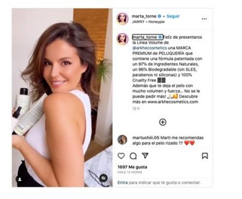 Torné compartirá en redes sociales sus experiencias con la marca premium de VMV Cosmetic Group. Marta Torné cuenta con más de 500.000 seguidores en la red social.