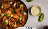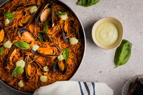 4. Sacar la carne de los mejillones de la concha y colocarlas encima de la fideuá en el momento que esté reposando para que cojan temperatura y no se pasen de cocción. Añadir el alioli de albahaca al servir.