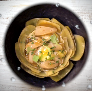 ALCACHOFA CONFITADA CON JUGO DE IBÉRICO, CON MARIDAJE DE MAGMA DE CABREIROÁ