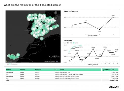 Esta capacidad, además de facilitar una información valiosa y única, permite también contextualizar las ventas de esa tienda en función de las cifras de ventas totales en su área, al obtener la misma información para otros competidores en un determinado radio de actuación. De este modo y gracias a Algori cualquier retailer puede saber −de forma única− su verdadera “cuota de mercado real”, es decir, qué porcentaje de ventas tiene en relación con todo lo que se vende en un área determinada y configurada a medida.
