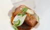 Tapa: Bonito, morrón, cebolla y pasión tiene como base un bonito del norte marinado, servido con unas cebolletas asadas y un jugo de pimientos asados, fruta de la pasión y ternera.
