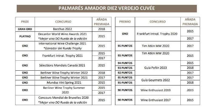 Esta medalla reconoce a la última añada de Amador Diez como el mejor DO Rueda de esta edición del certamen a criterio de los Masters of Wine, Masters of Sommelier, periodistas especializados, sumilleres, enólogos que conforman el jurado del certamen, al tratarse del único vino de esta denominación de origen incluido en el listado de Grandes Oros de la edición 2022 del concurso de la UEC.