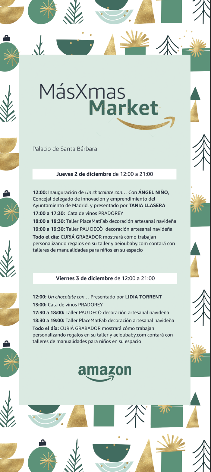 Los próximos días 2 y 3 de diciembre, Amazon abrirá al público las puertas de MásXmas Market, un mercado navideño que organizará en el madrileño Palacio de Santa Bárbara, y en donde “lo pequeño se hará grande”. Y es que este espacio estará dedicado a las 12 000 pequeñas y medianas empresas españolas que venden sus productos en Amazon, y contará con la presencia de algunas de ellas como Panapop, PRADOREY, PAU DECÒ, Ostrichpillow, Meller o Singularu, entre otras.