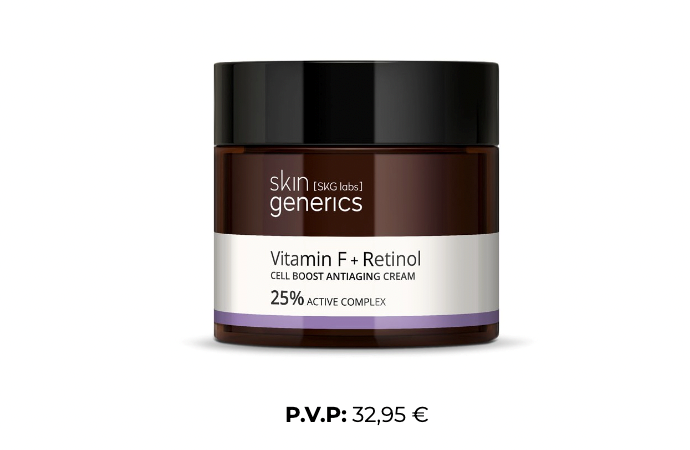 La Crema Regeneradora Celular Anti-Edad Vitamina F + Retinol de Skin Generics cuenta con un 25% de complejo activo y es el anorak perfecto para la piel. Cuenta con Vitamina F para ayudar a restaurar la barrera natural, favoreciendo la reducción de las rojeces y el exceso de sebo al tiempo que potencia la luminosidad del rostro. Se combina con retinol, que también trabajará en la regeneración de la piel por las noches al renovarla a nivel celular. Por último, suma a la fórmula Repair Complex, un complejo patentado que protege la piel de los daños ocasionados por la radiación UV.