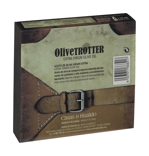 El estuche OliveTROTTER, con su diseño compacto, robusto y ligero, se puede llevar tanto en el equipaje de mano (caso del avión puesto que no supera los 100ml) como en el facturado, sin riesgo de roturas ni sorpresas desagradables. Contiene cuatro AOVEs singulares, elaborados con esmero a orillas del río Tajo a partir de aceitunas Arbequina, Picual, Cornicabra y Manzanilla Cacereña. Cada uno de ellos posee sus particularidades y permiten disfrutar de múltiples maridajes, a la vez que cuidan de nuestra salud.