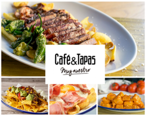 La cadena de restaurantes Café & Tapas es el lugar ideal para disfrutar de una mañana de tapas gracias a la gran variedad de opciones de su carta con sabores muy nuestros. Entre su oferta de tapas destaca el entrecotte trinchado con patatas gajo y pimientos del padrón. Ideales para compartir son los huevos rotos con patatas gajo y jamón ibérico, las gambas al ajillo o la tabla de ibéricos. Para aquellos que busquen algo más internacional están los nachos Tex Mex con guacamole, queso Cheddar, crema fresca y ternera marinada con salsa Tex Mex, pimiento rojo, pimiento verde y maíz.