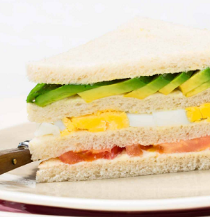 Sobre un pan untar mayonesa, poner rodajas de tomate. Cubrir con otro pan, untar también con mayonesa y colocar el huevo duro. Añadir una nueva capa de pan, untar con mayonesa y poner el aguacate cuidadosamente. Sazonar con sal y pimienta.