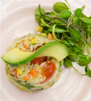 En un bowl mezclar todos los ingredientes, revolver bien y sazonar con sal y pimienta. Colocar la mezcla en un molde individual, presionar bien con una cuchara y desmoldar sobre un plato. Decorar con una rodaja de aguacate y servir acompañado de berros.