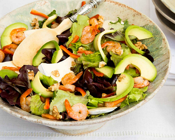 En un bowl colocar las hojas verdes, el aguacate, el queso Camembert, los langostinos reservados, las nueces y el pimiento. Servir con el aliño de mostaza reservado.