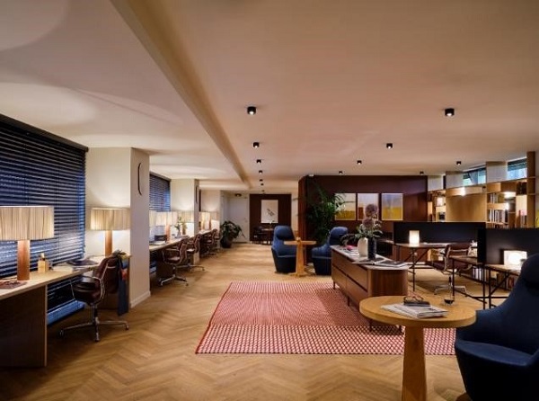 En la primera planta se encuentra The Study, un espacio diáfano de coworking de 170 metros cuadrados donde impera el silencio y la tranquilidad. La atmósfera cálida y acogedora del ambiente se consigue gracias al uso de la madera como eje principal en el suelo de parqué espigado y mesas, y también por la luz indirecta que proporcionan las lámparas de la firma Santa & Cole. Los tonos tierra y neutros en los tapizados de sillas y butacas, junto a las paredes de color burdeos que contrastan con el blanco del resto del espacio, aportan una gran sensación de calidez que invita al estudio y el sosiego.