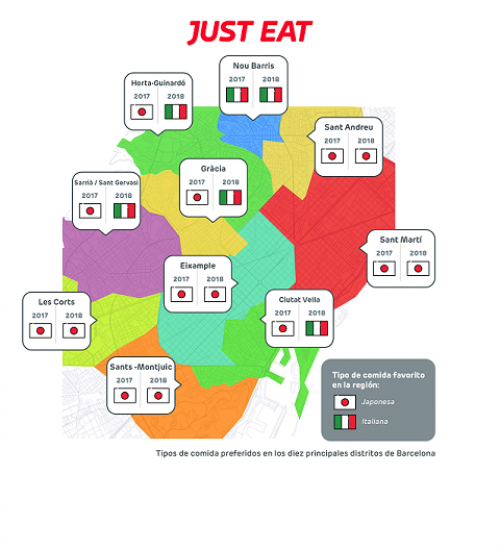 Para conocer mejor los gustos de los usuarios más foodies, Just Eat, la compañía líder del sector de comida a domicilio en España, ha querido analizar cómo se alimentan los barceloneses cuando piden comida a domicilio. Los resultados del estudio[1] de Just Eat, reflejados en un mapa de los diez distritos de Barcelona, muestran que los barceloneses apuestan por sabores internacionales. Así, de los 60 tipos de comida que pueden encontrarse en Just Eat, la plataforma de comida a domicilio con más variedad, los barceloneses se decantaron durante el primer semestre de 2018 por la cocina japonesa, que registró el 29% del total de pedidos, empatando con la italiana (29%) y seguido de la china (12%).