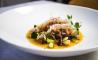 - Caballa presalada & asada en escabeche de naranja y jengibre, Pulpo asado, causa limeña, salpicón y aceite de cebollino.