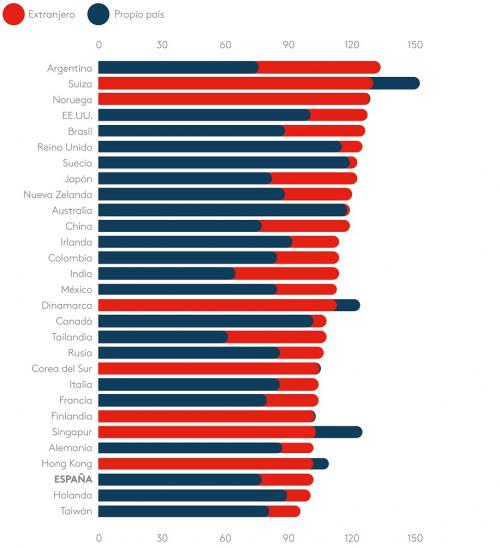 Tan solo siete países pagaron más en casa que en el extranjero. Los viajeros de Singapur fueron de nuevo los que registraron una mayor diferencia al pagar 23 euros más de media a nivel doméstico. En segunda posición se encuentran los viajeros suizos con una variación de 22 euros, seguidos de los daneses con 11 euros de diferencia.