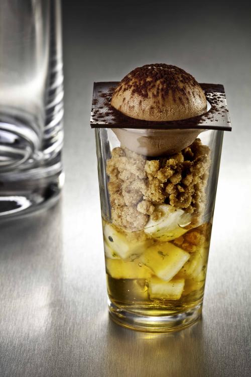 Reducción de Barceló Imperial, plátano osmotizado con lima, streuzel y mousse de chocolate del 75% cacao