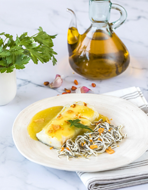 4. Una vez listo, sirve el bacalao junto con las gulas. Termina el plato colocando encima las láminas de ajo y un trocito de guindilla, una hojita de perejil y ¡a disfrutar!