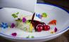 Gazpacho de cereza con tartar de langostinos y helado de jengibre