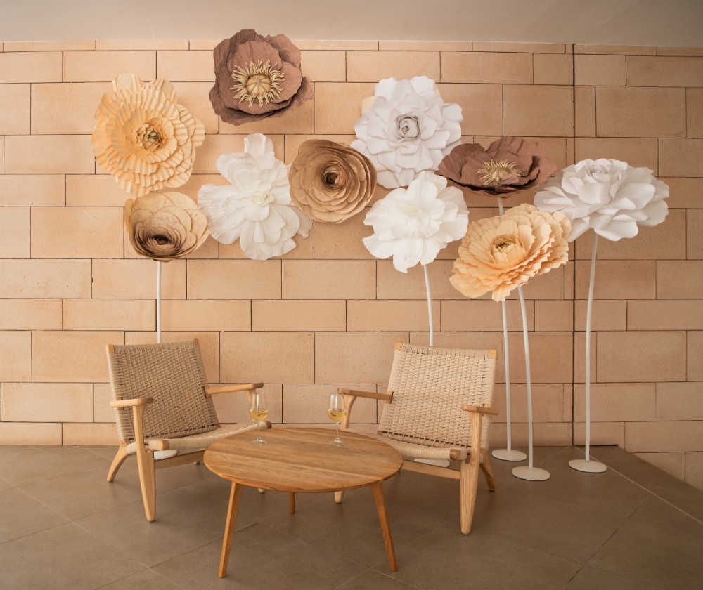 "Para crear estas flores me he inspirado en Menorca, en Barceló Nura. Para mí pensar en Menorca y en Barceló Nura es pensar en calma, en descanso, en cargarse de energía positiva. Pasear por sus playas, pisar su arena, bañarme en sus playas, y luego acabar el día disfrutando en el hotel Barceló Nura con un baño en su piscina rodeada de naturaleza. Esta ha sido mi inspiración para crear estas flores de papel, utilizando los tonos más característicos del hotel: tonos suaves, blancos, crema, beige... Flores grandes con texturas onduladas y creadas usando papeles reciclados de gran calidad, que aportan resistencia y durabilidad, para que puedan tener muchas vidas. Esta colaboración ha sido un sueño porque me ha permitido juntar algunas de las cosas que más me gustan de la vida: viajar, Menorca y las flores de papel." comenta Cristina Velasco de Velasco Mora Studio.