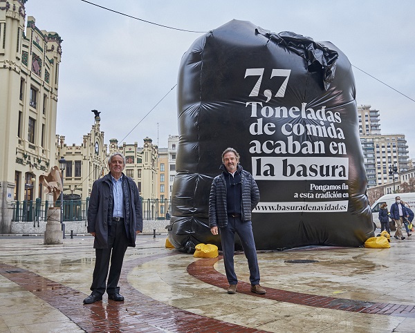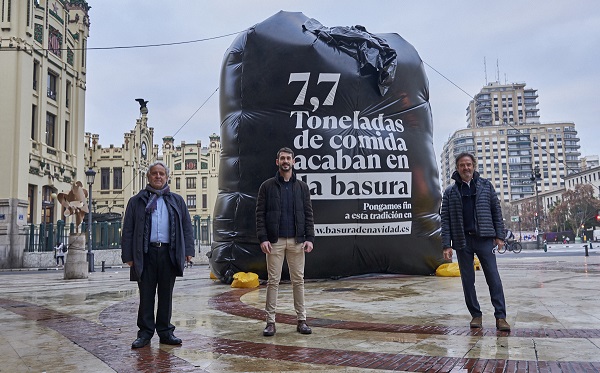 Esta mañana Valencia ha amanecido con una bolsa gigante de basura frente a la Plaza de toros con la que la empresa de comunicación AGR Food marketing, sus clientes y colaboradores, todos vinculados al sector alimentario, quieren acabar con la tradición navideña de desperdiciar más de 7,7 toneladas de alimentos mientras miles de familias pasan necesidad. La acción reivindica la compra responsable y promueve la donación a la Federación de Bancos de Alimentos (FESBAL) a través de la plataforma Nadie Sin Su Ración Diaria.