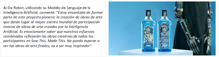 Como parte del compromiso continuo de la marca de apoyar la creatividad y las artes, dos ediciones limitadas de la etiqueta de la botella de Bombay Sapphire, pintadas por Ai-Da Robot, se expondrán en las instalaciones “Saw This, Made This” y se pondrán a la venta el Día Mundial de la Creatividad en la tienda del Design Museum y en BombaySapphire.com. La sede neoyorquina también pondrá a la venta distintos artículos de edición limitada con obras de Ai-Da Robot, con el objetivo de apoyar, con los beneficios vinculados, a diseñadores y artistas emergentes a través de sus correspondientes programas, tanto de la Chelsea Factory como del Museo del Diseño.