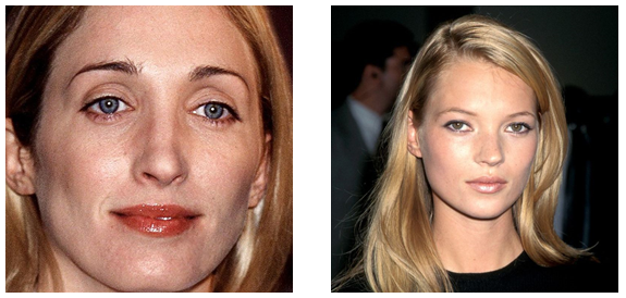 Carolyn Bessette, icono del minimalismo de los 90, con un brillo de labios natural a juego con el tono de sus labios. Y Kate Moss en una foto de los 90 con brillo de labios en versión metalizada.
