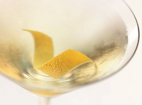 - Rocía el líquido procedente de girar la guarnición de cáscara de naranja o limón directamente en una copa de cóctel de Martini bien fría o congelada, y seguidamente coloca la guarnición en el vaso.
