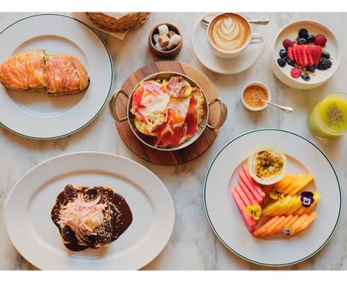 Además de los platos puramente mexicanos, Jerónimo propone una serie de propuestas que hacen un guiño a los platos más tradicionales de España, materializando una vez más en su propuesta la conexión con el país, como los huevos rotos con jamón o el pan con tomate y jamón ibérico; a los que se suman otros de corte internacional como el pudín de chía, leche de almendras, plátano y granola o la tostada de masa madre con aguacate, salmón ahumado, pepino y salsa macha. No puede faltar tampoco el pan francés con crême fraîche y frutos rojos de temporada para poner la nota dulce, mientras que los clásicos de los desayunos tardíos como los huevos benedictinos se acompañan de carabineros a la parrilla.