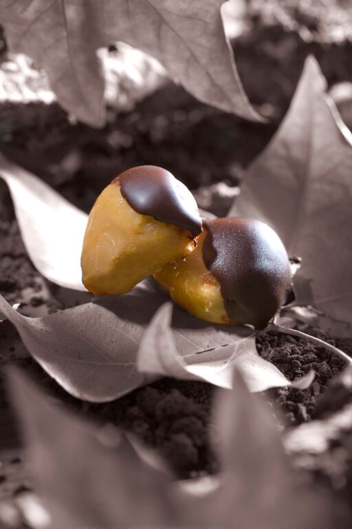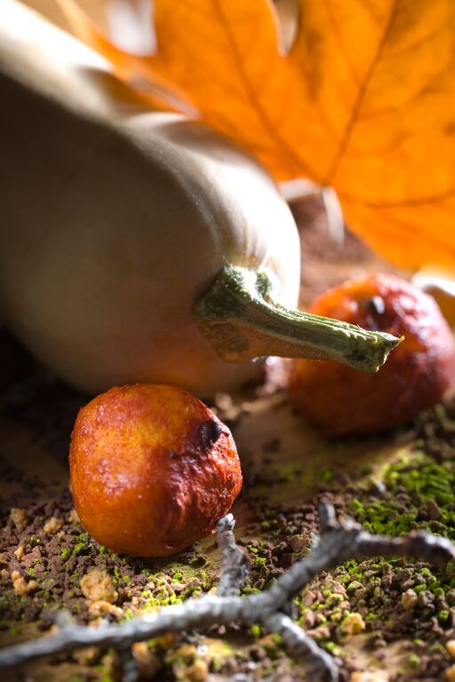 El otoño también huele a setas, a boletus, a trufa.... como podemos apreciar en el Buñuelo de Crema de Boletus (boletus confitados con reducción de P.X.) y en el Buñuelo de Crema de chocolate con trufa negra, éste último con una textura de tierra como el lugar que envuelve las trufas antes de la recogida, pero con un sabor a chocolate negro.