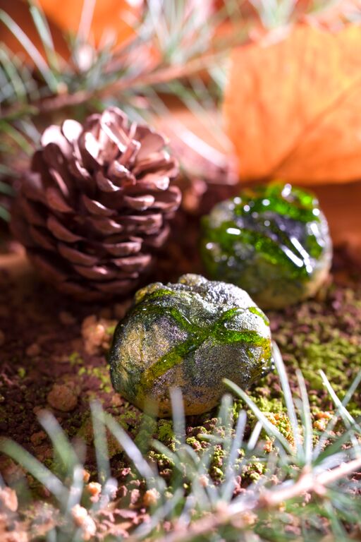 Seguimos con nuestro paseo y nos encontramos trozos de corteza de árbol mojados por la lluvia que tienen un tacto flojo y en el ambiente se siente un punto de humedad. Los árboles desprenden un olor a vegetación sana, como en el Buñuelo de Crema de Pino, eucalipto y tomillo limonero, elaborado con una crema pastelera cuya fusión de ingredientes dan lugar a estos aromas a bosque y plantas.