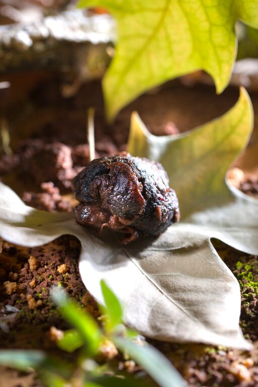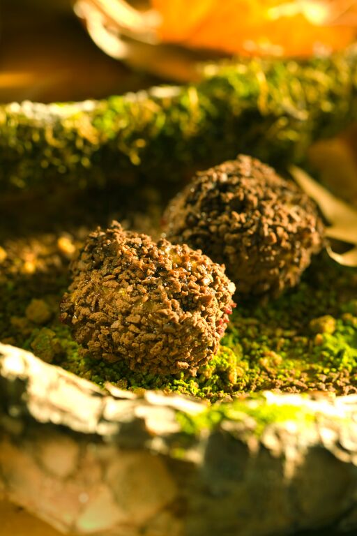 En nuestro paseo por el bosque el aire de otoño huele a musgo y a tierra mojada. Así lo plasma José Fernández en el Buñuelo de Tierra húmeda con musgo, un buñuelo elaborado con un streusel de cacao que al morderlo desprende ese aroma a tierra mojada, pero un sabor delicioso.