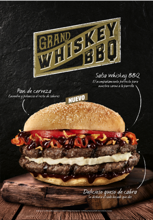 Con el objetivo de seguir sorprendiendo a todos los consumidores, Burger King® España presenta dos exclusivas hamburguesas: Grand Whiskey BBQ y Grand Whiskey BBQ Tendercrisp®. La compañía amplía así su abanico de productos y ofrece nuevas posibilidades a los clientes, diferentes a las que había ofrecido hasta ahora. Las nuevas hamburguesas estarán disponibles desde hoy, por tiempo limitado, en todos los restaurantes de España y también a través del servicio a domicilio.