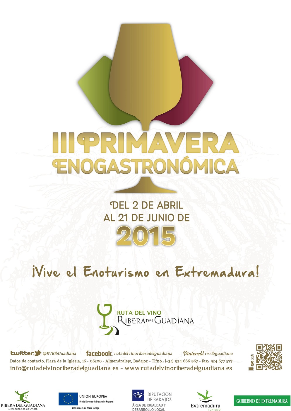 La Ruta del Vino Ribera del Guadiana celebra en 2015 la 3ª edición de su Primavera Enogastronómica el gran evento que llenará las comarcas que la integran de multitud de actividades singulares para todos los públicos, entre los que se cuentan rutas en vespa entre viñedos, recreaciones históricas, talleres de enología, vinoterapia, cursos de cata, competiciones deportivas o viajes en globo, entre otros.